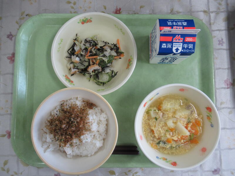 麦ごはん、手作りふりかけ、親子煮、ひじきのマヨサラダ
