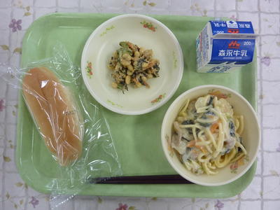 黒糖パン、スープスパゲティ、さつま芋のサラダ、牛乳