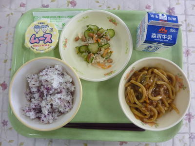 麦ごはん、大豆の磯煮、春雨の酢の物、のりたまふりかけ、牛乳