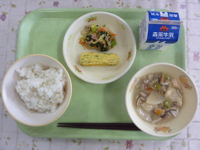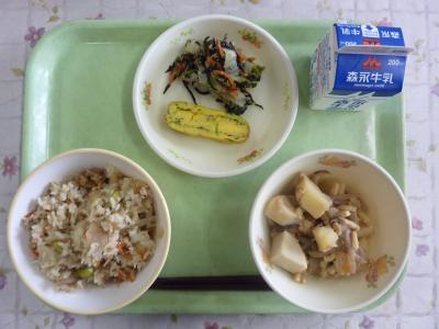 大根めし、里芋のそぼろ煮、白菜のひじき和え、ほうれん草のだし巻き卵、牛乳