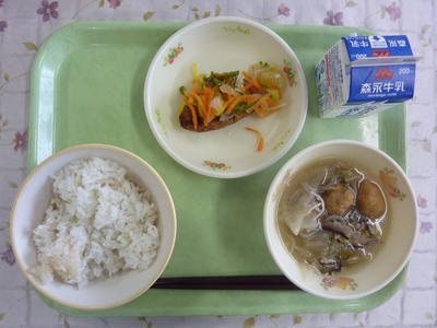 麦ごはん、チンゲン菜の中華スープ、魚の南蛮漬け、牛乳