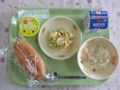ミルクパン、南瓜のクリームスープ、甘酢サラダ、牛乳
