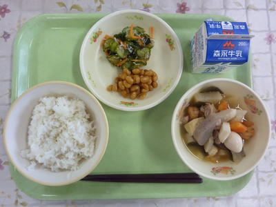 麦ごはん、さつま汁、ごぼうとナッツのカミカミサラダ、納豆、牛乳