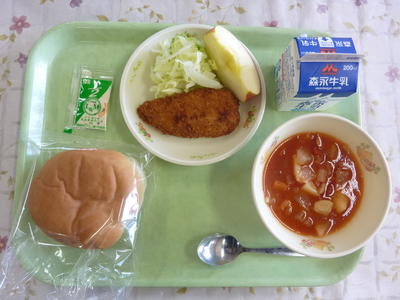 セルフフィッシュバーガー、豆とトマトのスープ、リンゴ、牛乳