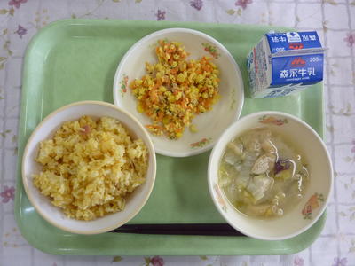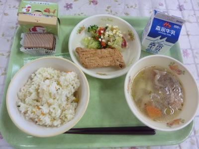 ごぼうピラフ、コンソメスープ、さつま芋サラダ、牛乳