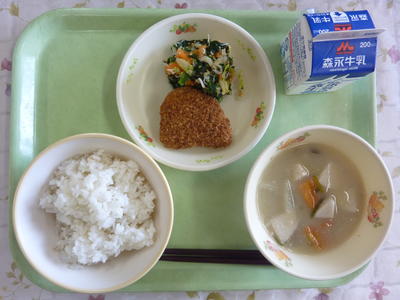 麦ごはん、だごじる、小松菜しらす玉子焼き、菜焼き、牛乳