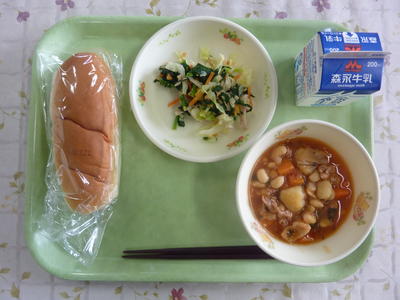ミルクパン、ポークビーンズ、ほうれん草のサラダ、牛乳