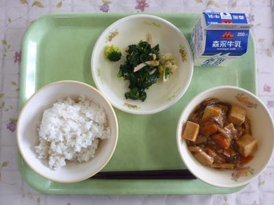 麦ごはん、麻婆豆腐、バンサンスー、牛乳