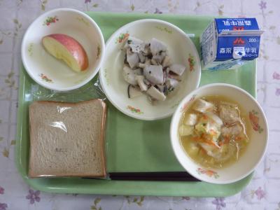 黒糖パン、鶏団子スープ、里芋ときのこのガーリック炒め、りんご、牛乳