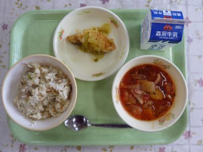 牛蒡ピラフ、豆とトマトのスープ、魚のカレーマリネ、牛乳
