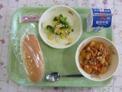 パン、鶏肉とチンゲンサイのクリーム煮、コーンサラダ、ミカンジャム、牛乳