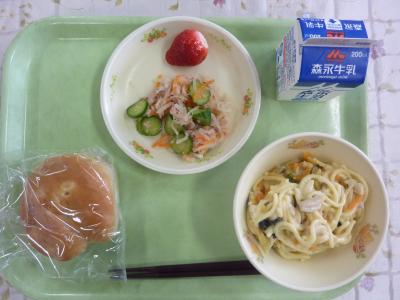 パインパン、鶏肉とほうれん草のクリームスパゲティ、大根ツナサラダ、いちご、牛乳