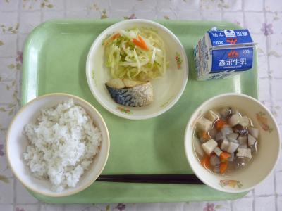 麦ごはん、味噌けんちん汁、サバの香味焼き、茎わかめの酢の物、牛乳
