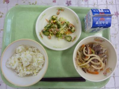 きびご飯、すき焼きうどん、かみかみサラダ、牛乳