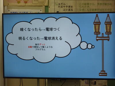 ICT支援員さんにゲスト・ティーチャーとして入っていただき授業を行いました。「プログラミング・スイッチ」というアプリと装置を使っての学習です。「暗くなったら電球がつく」「明るくなったら電球が消える」というプログラムを組みます。
