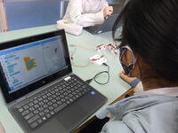 その後、「電球が、暗くなったらつき、明るくなったら消える」というプログラムの組み上げに挑戦しました。できたら、明るさセンサーが付いた実際の回路をUSBでつなぎます。プログラムが正解だったら、センサーを指で押さえて暗くすれば電球がつき、指を離せば電球が消えます。