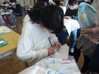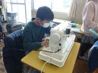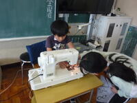 ミシンを使って縫いますので、なかなかうまくいかない場面もあるようですが、お互いに協力し合って頑張っているようです。手縫いで仕上げをしている子もいます。できあがりが近く、紐通しをしていいる子もいました。