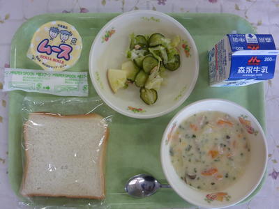 食パン、クリームシチュー、フレンチサラダ、ムース、牛乳