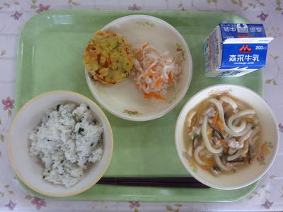 わかめご飯、うどん、かきあげ、大根なます、牛乳
