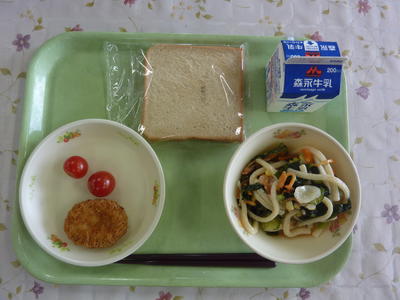 黒糖パン、サラダうどん、枝豆と豆腐のメンチカツ、ミニトマト、牛乳