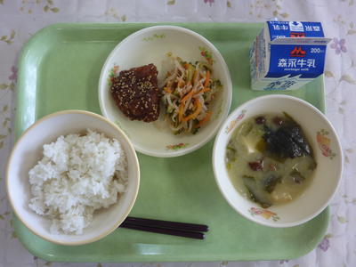 むぎご飯、みそ汁、ソースかつ、ツナとゴーヤのサラダ、牛乳