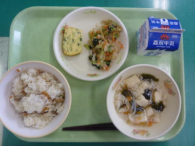 南関揚げのまぜご飯、ふしそうめん汁、だし巻き玉子、小松菜のおかか和え、牛乳