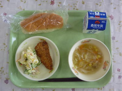 ミルクパン、コンソメスープ、あじごまフライ、ポテトサラダ、牛乳