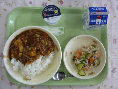 夏野菜カレー、じゃこナッツサラダ、ヨーグルト、牛乳