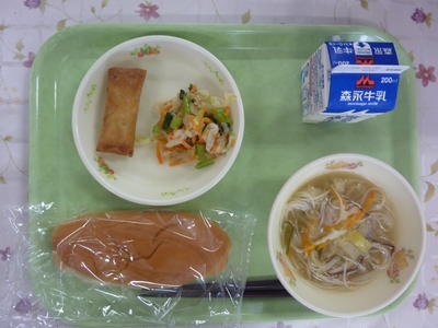 ミルクパン、汁ビーフン、春巻き、小松菜のおかか和え、牛乳