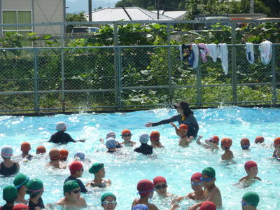 上の写真は1年生と2年生の様子です。1年生は、4~5名ずつプールの横を泳ぎました。最初は大きなプールをこわがっていた子どももいたようですが、今はみんなプールが大好きです。2年生は20mに挑戦しました。まだまだ、息継ぎが難しそうですが、水をこわがることもなく、みんな楽しそうに泳ぐことができていました。