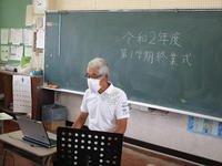 コロナウイルス感染拡大防止のため、始業式と同様にウェブと各学級の大型テレビを活用して行いました。私から、「この1学期間、欠席がとても少なく、コロナウイルスに負けずにしっかり頑張れました。」と全員を褒めました。また、夏休み期間中は、日ごろ取り組んでいる「四つのあ」を学校外でもがんばっていってほしいと伝えました。