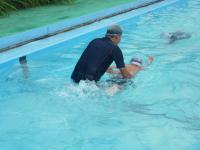 泳力が高い子供たちは、ペアで教え合い、確認し合いながらそれぞれのめあてに挑戦していきます。少し補助が必要な児童には教師が支援に入ります。