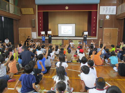 先日(6/20)に児童集会が行われました。今回は環境委員会からの発表でした。