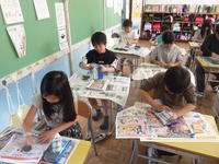 1年生は恐竜づくりに挑戦しました。初めての経験なので、みんな興味津々で参加していました。新聞紙を芯にして作っていく方法を高田さんに教えていただき、みんな頑張って作りました。