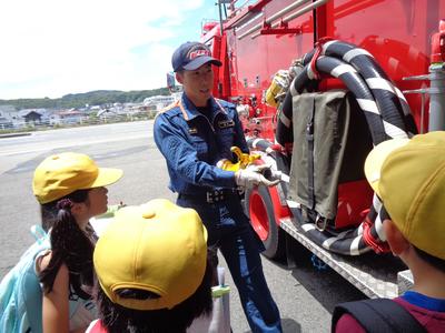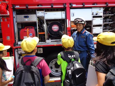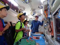 まずは、上益城消防本部を見学しました。消防車の説明をしていただき、救急車は中に入れていただくこともできました。