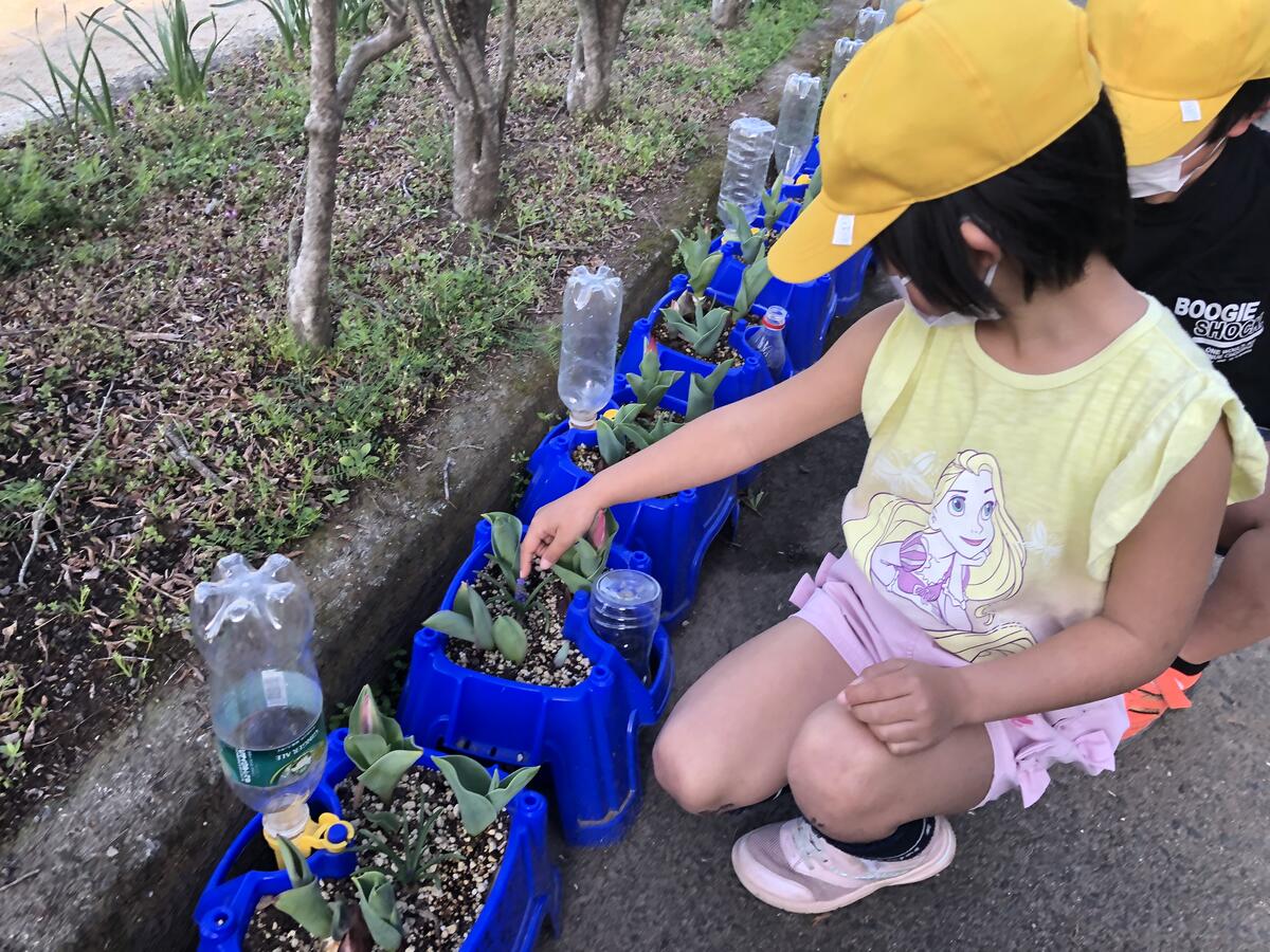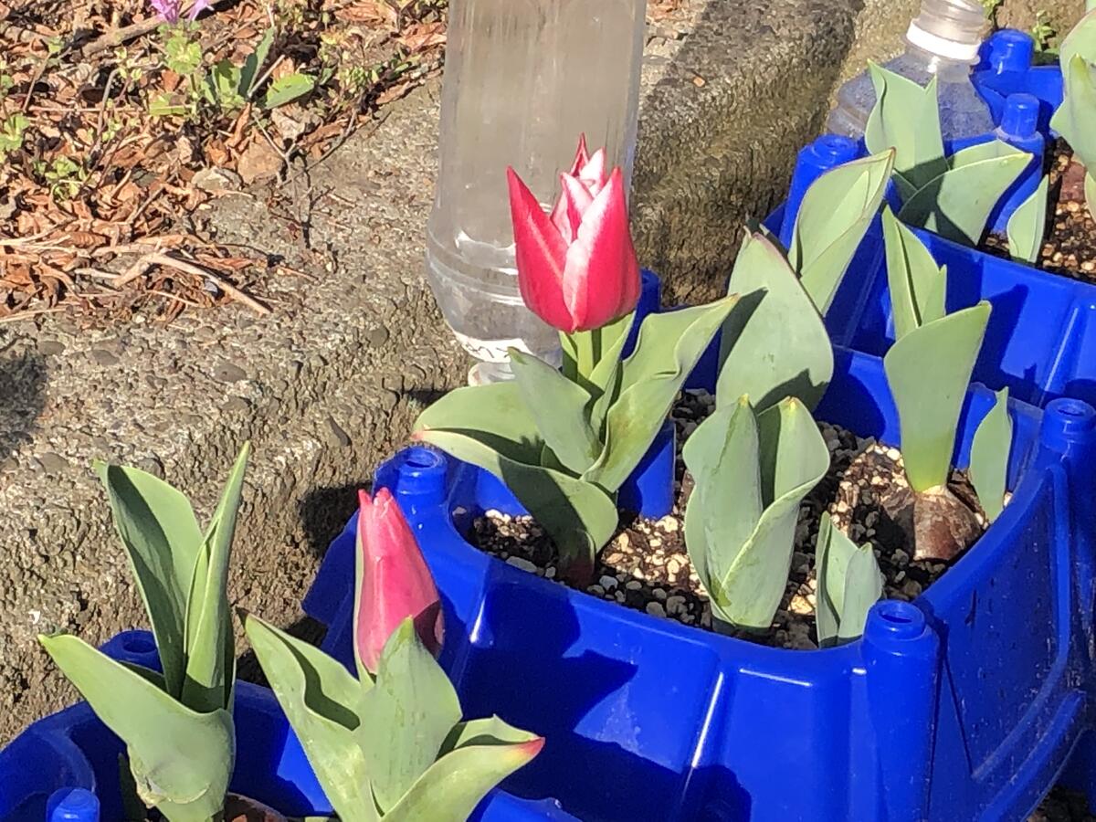 1年生が育てているチューリップも、いくつか花を広げていました。毎朝水をあげて大切に育てている1年生もとてもうれしそうです。