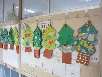 クリスマスが近づき、1年生は図工の学習で、針金ハンガーを使った吊り下げ式のクリスマスツリーを作りました。
