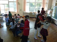 今日の学習は、お店屋さんごっこを英語で行い、色画用紙を集めることです。代表の子どもたちのお手本を見た後、二人組で練習です。先生も手伝ってくれています。