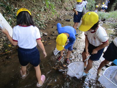 今週から少し肌寒くなってきたこともあり、はじめは「冷たい!」と言っていた子供たちですが、あちこちから「カニ見つけた!」「魚おった!」と声が上がり始めると、みんな夢中で生き物探しに取り組んでいました。