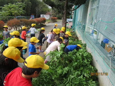 11月19日(火)に、待ちに待った大根の収穫を行いました。簡単に抜けるだろうと思っていた子どもも多い中、「先生、無理です。」という声。初めて体験した、大根の収穫の大変さと、思った以上に大きく成長していたことに感動していました。