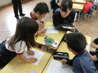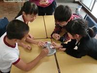 その後は、いよいよ実験です。粘土の形をいろいろと変えながら、それぞれの重さを量っていきます。今日は研究授業なので、担任以外の先生方が少し手伝ってくれました。