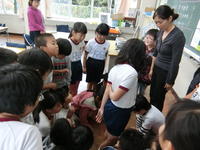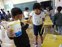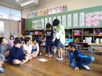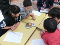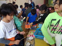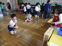 1年生手作りのおもちゃで、「けんだま」「魚釣り」「たいこ」「的あて」「的入れ」「やじろべえ」「マラカス」などを笑顔で楽しんでいました。1年生のおかげで、2年生は楽しいおまつりに参加することができました。