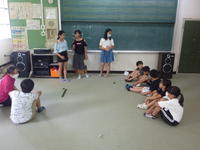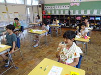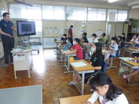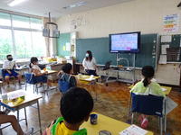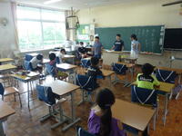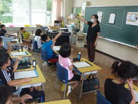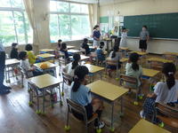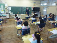 最初の学習では戸惑う子供たちが多いので、運動会の全校ダンスの指導等、様々な場面で子供たちの指導にご協力をいただいている、元民生児童委員の木村みち子先生に授業に入っていただきました。