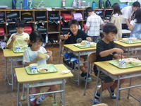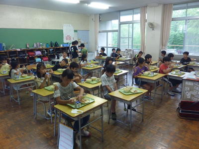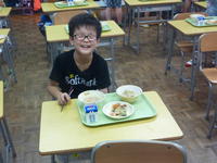 写真は4年生の様子です。「えびフライ大好き!」「今日のメニューは最高」などと言いながら、みんなもりもりとおいしそうに食べていました。給食センターの職員の方々、いつもおいしい給食ありがとうございます。