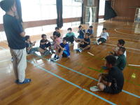 「タタタターンのリズムで、3歩か5歩で走ると跳びやすい」という友達の気づきをみんなで共有してもう一度練習です。