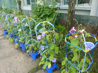 1年生が、生活科の学習で育ててきた朝顔が、今たくさん咲いています。写真は、今日(6月29日)の朝の様子です。