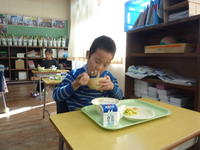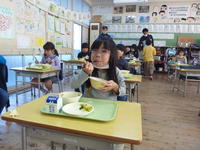 給食ではめったに食べることができない「鯛めし」を子供たちは大喜びでほおばっていました。写真は2年生の様子です。