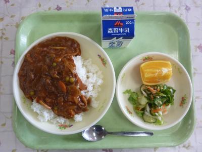 今日の給食のメインは、馬肉のハヤシライス! その他のメニューは、グリーンリーフのサラダとネーブルでした。