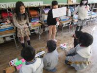 その後は、班に分かれて上級生の教室や職員室に豆まきに行きました。何も知らされていなかった上級生の子供たちはびっくりした表情でしたが、中にはすぐに豆を投げ返して対抗する子もいました。