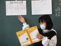 卒業生担任の湯本先生が保健の授業をしています。音楽が得意な小畑先生と保健体育が専門の湯本先生の長所を生かした指導ができています。